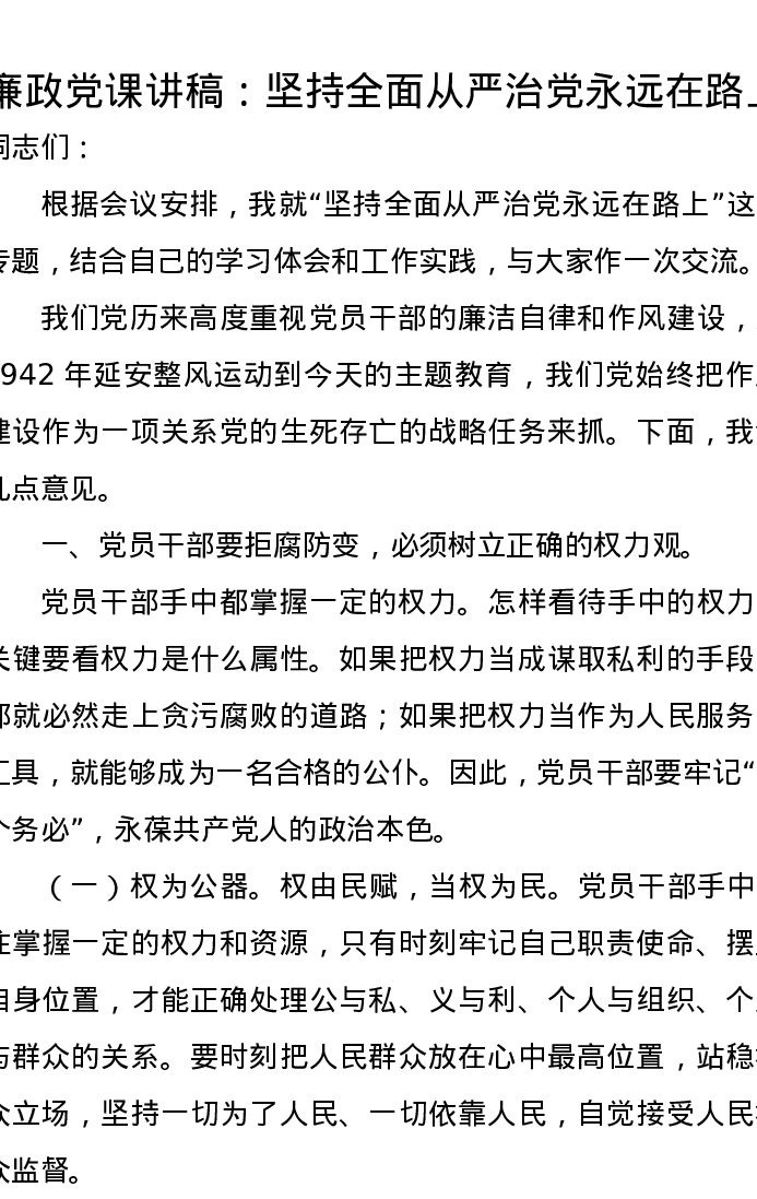 廉政党课讲稿:坚持全面从严治党永远在路上