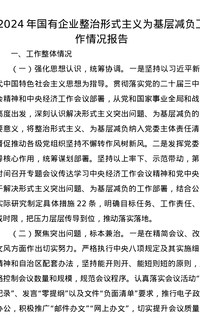 2024年国有企业整治形式主义为基层减负工作情况报告