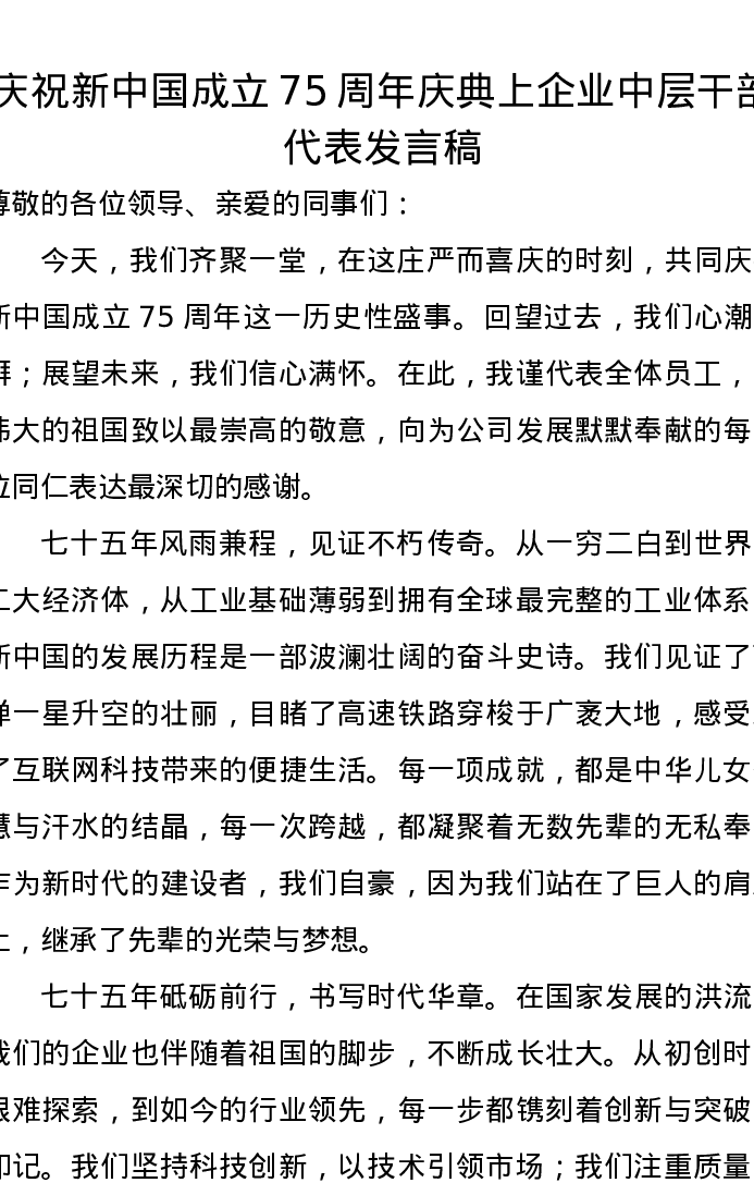 庆祝新中国成立75周年庆典上企业中层干部代表发言稿