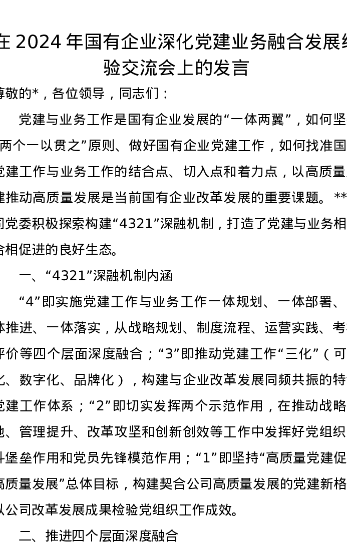 在2024年国有企业深化党建业务融合发展经验交流会上的发言