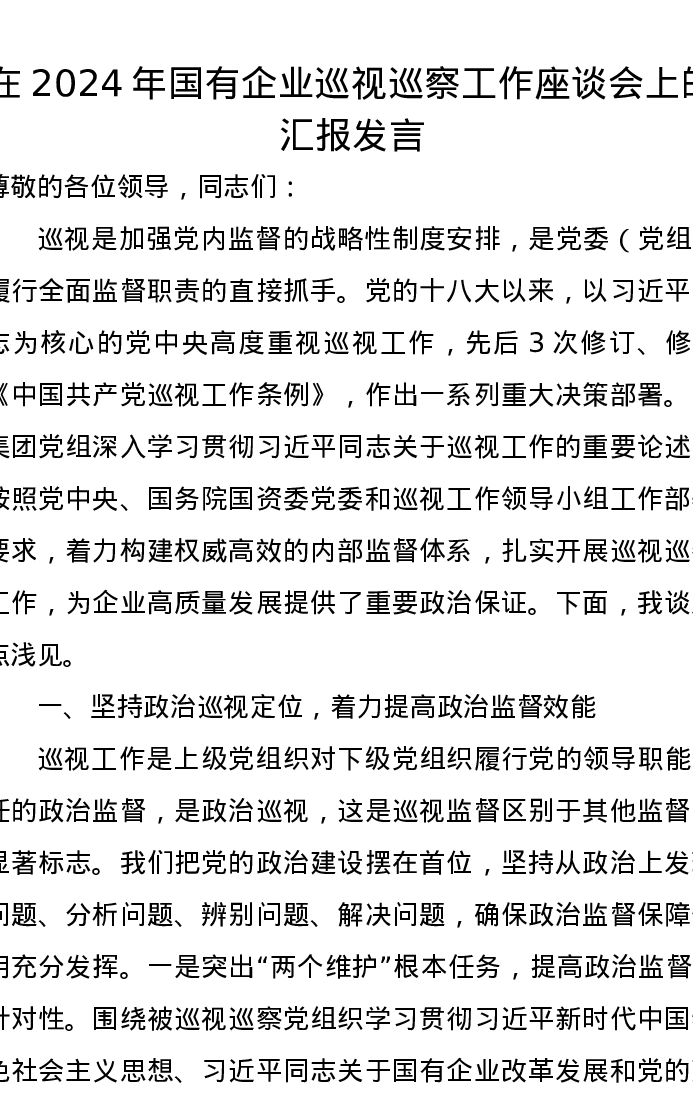 在2024年国有企业巡视巡察工作座谈会上的汇报发言