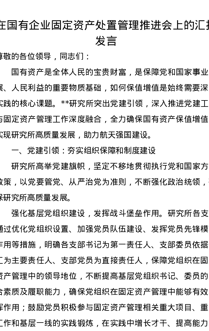 在国有企业固定资产处置管理推进会上的汇报发言