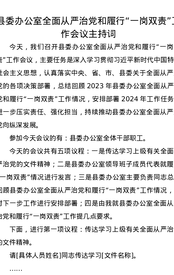 县委办公室全面从严治党和履行“一岗双责”工作会议主持词