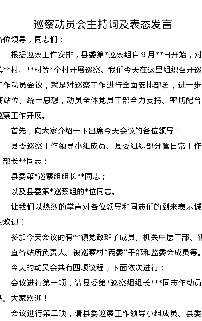 巡察动员会主持词及表态发言