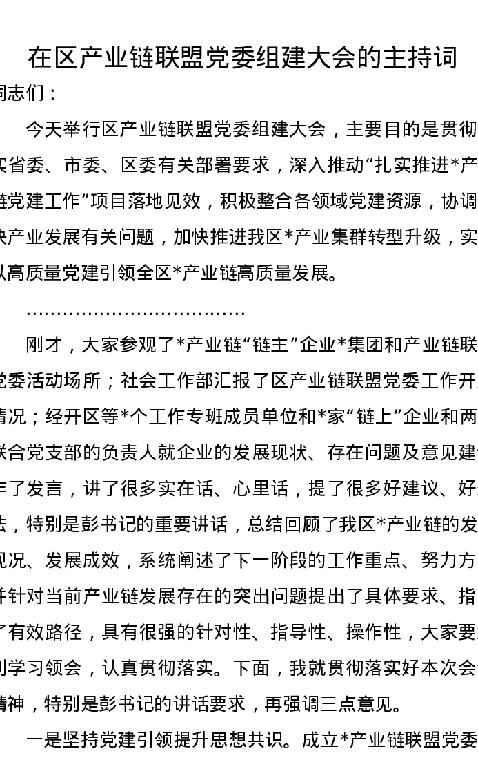 在区产业链联盟党委组建大会的主持词