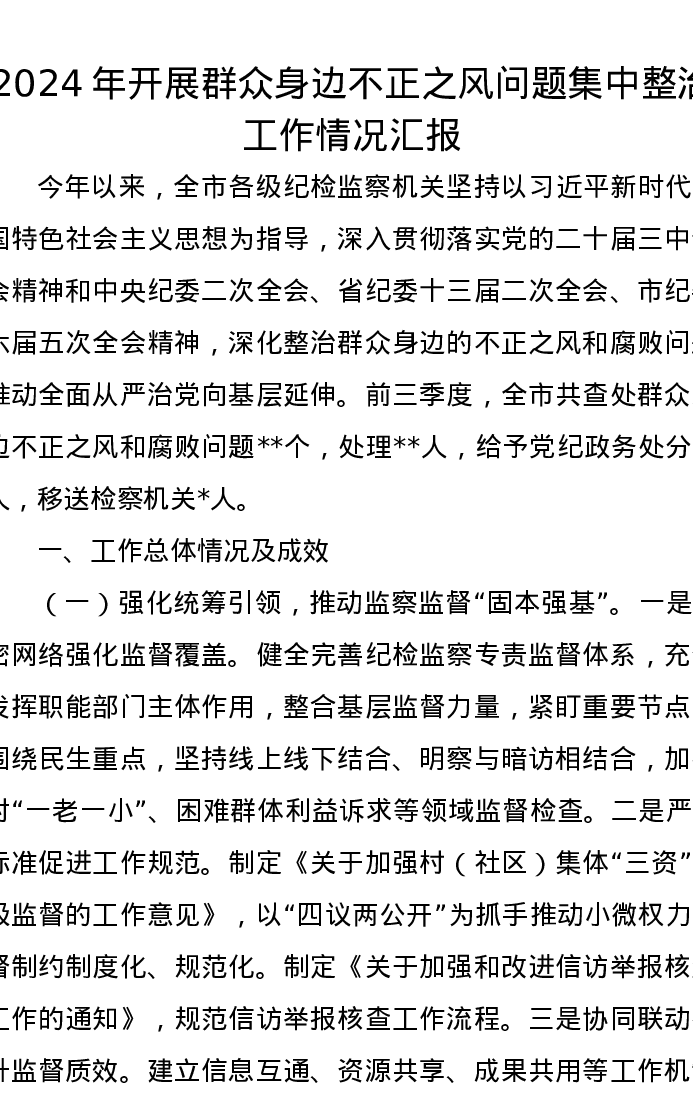 2024年开展群众身边不正之风问题集中整治工作情况汇报