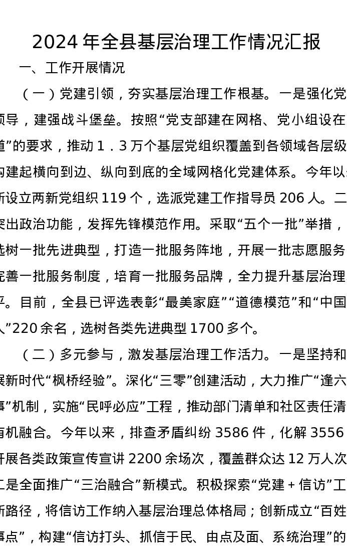 2024年全县基层治理工作情况汇报
