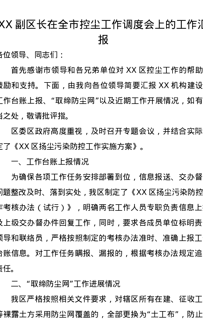 XX副区长在全市控尘工作调度会上的工作汇报