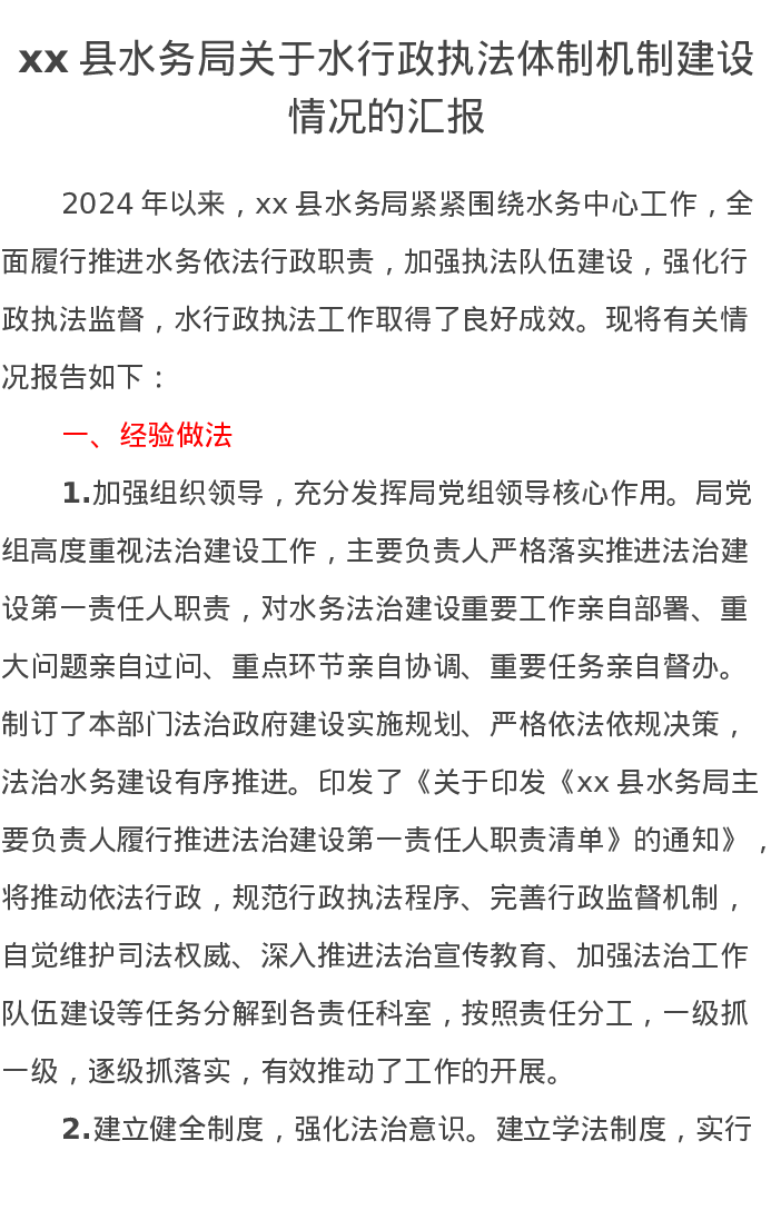 xx县水务局关于水行政执法体制机制建设情况的汇报