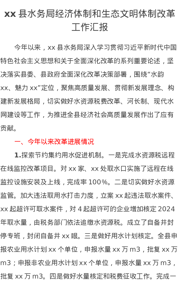 xx县水务局经济体制和生态文明体制改革工作汇报