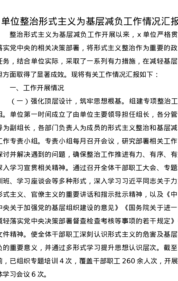 单位整治形式主义为基层减负工作情况汇报