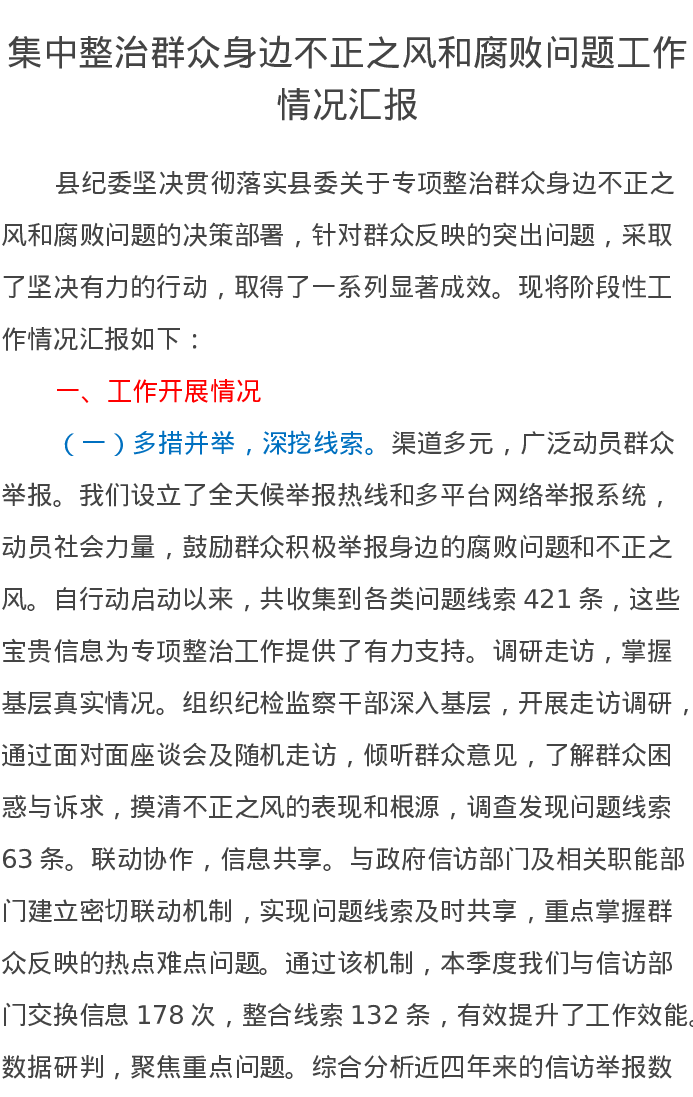 集中整治群众身边不正之风和腐败问题工作情况汇报