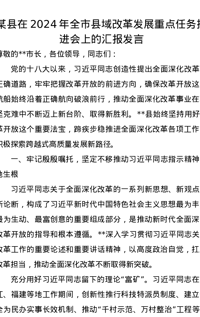 某县在2024年全市县域改革发展重点任务推进会上的汇报发言