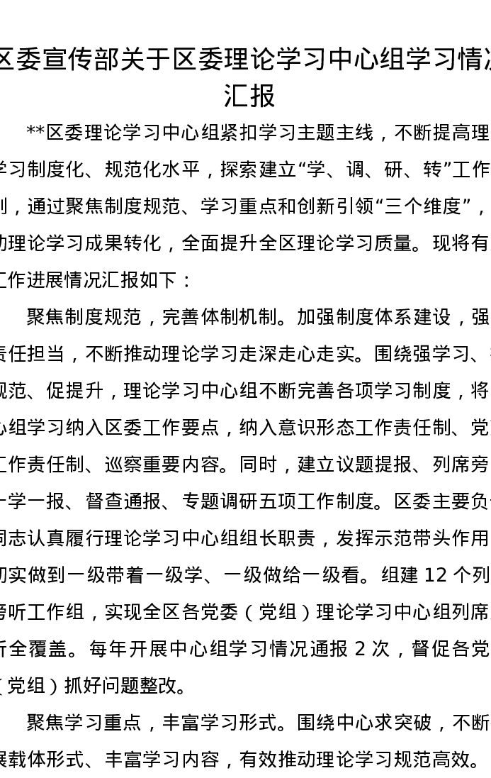 区委宣传部关于区委理论学习中心组学习情况汇报