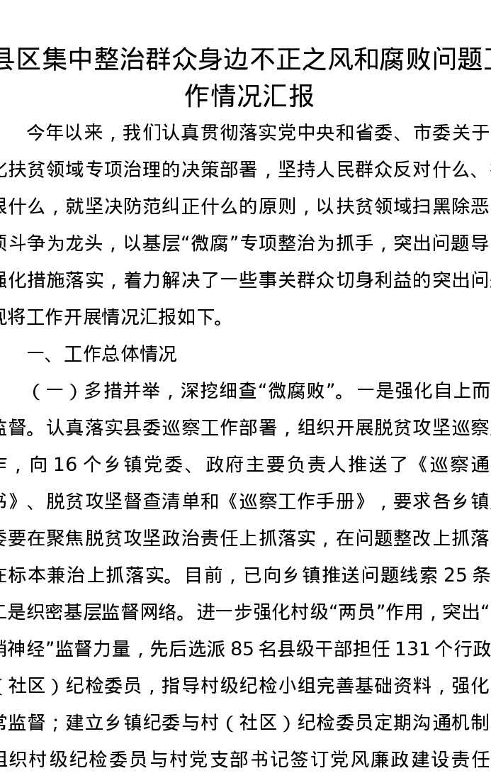 县区集中整治群众身边不正之风和腐败问题工作情况汇报
