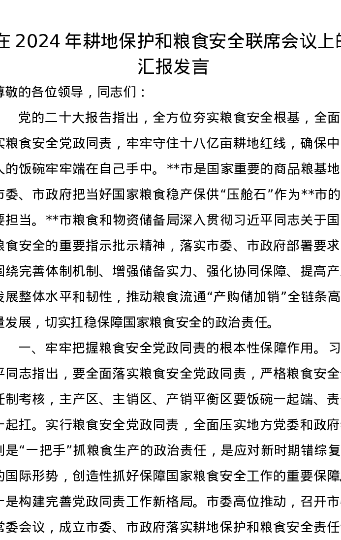 在2024年耕地保护和粮食安全联席会议上的汇报发言