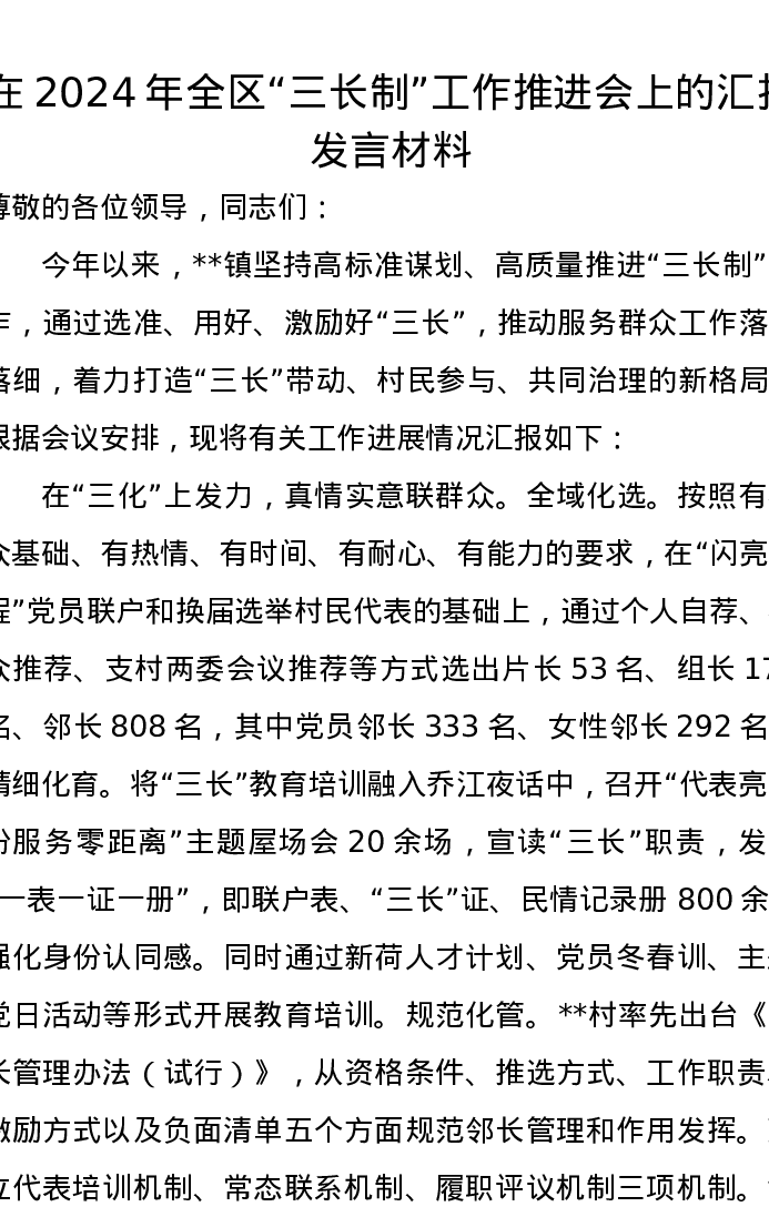 在2024年全区“三长制”工作推进会上的汇报发言材料