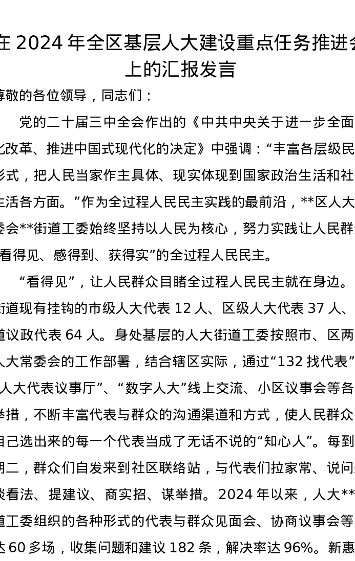 在2024年全区基层人大建设重点任务推进会上的汇报发言