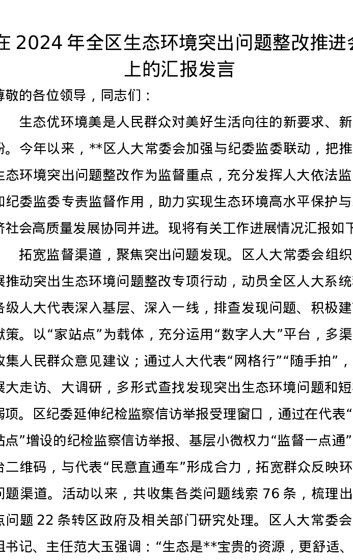 在2024年全区生态环境突出问题整改推进会上的汇报发言