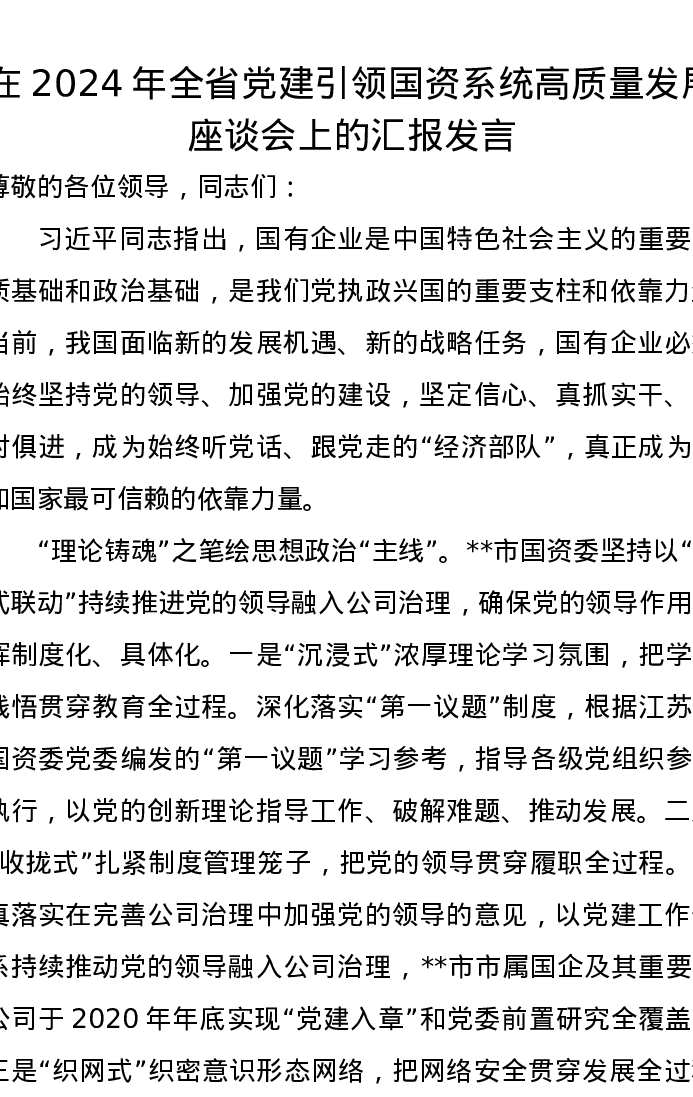 在2024年全省党建引领国资系统高质量发展座谈会上的汇报发言