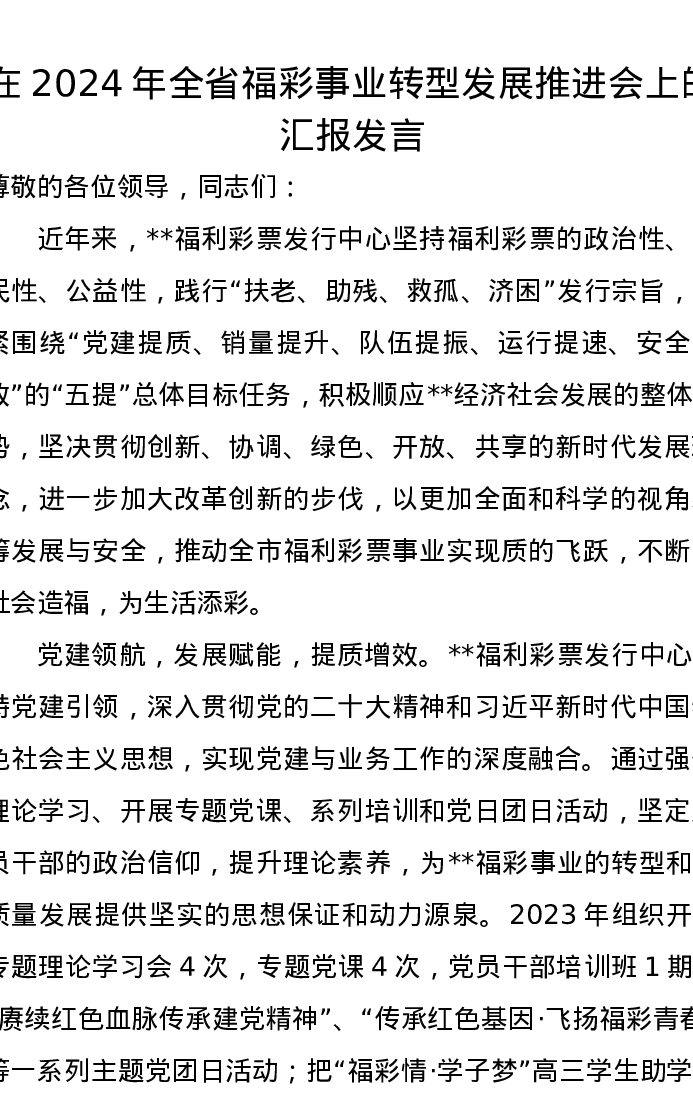 在2024年全省福彩事业转型发展推进会上的汇报发言