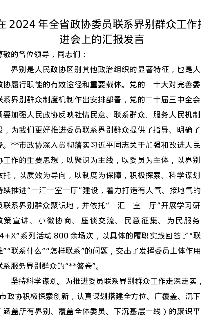 在2024年全省政协委员联系界别群众工作推进会上的汇报发言