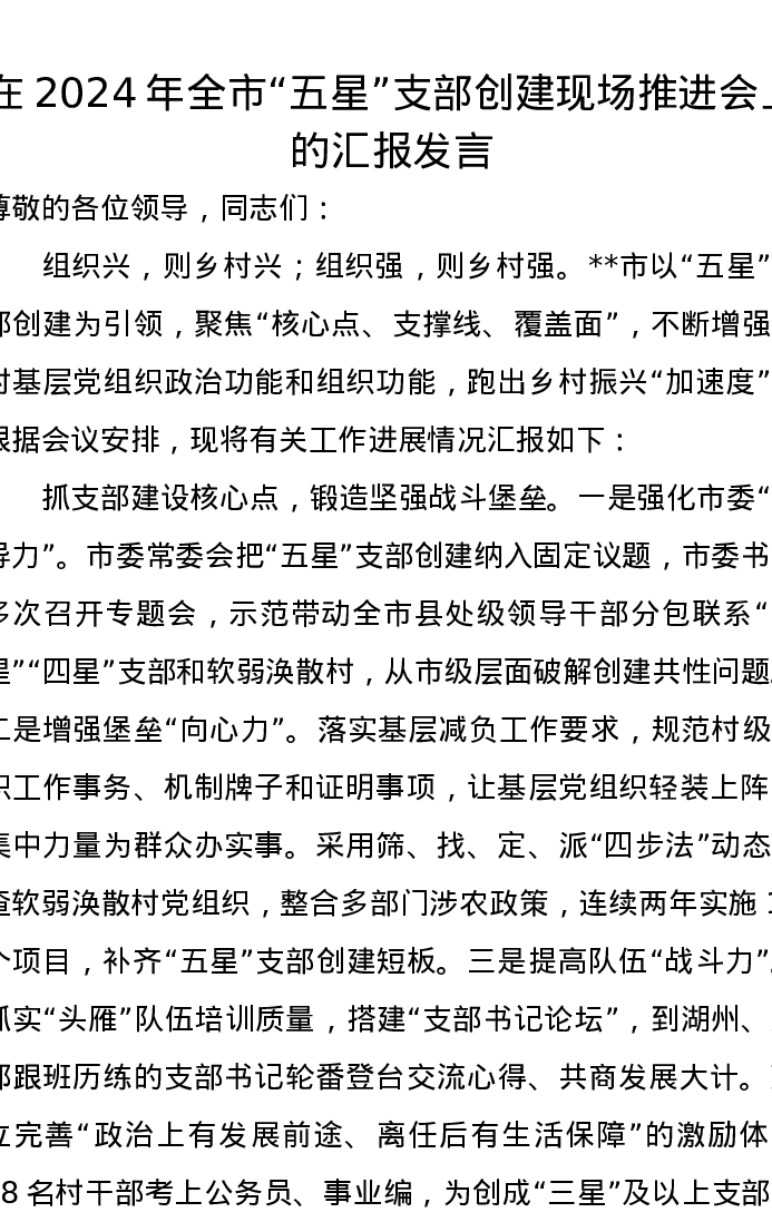 在2024年全市“五星”支部创建现场推进会上的汇报发言