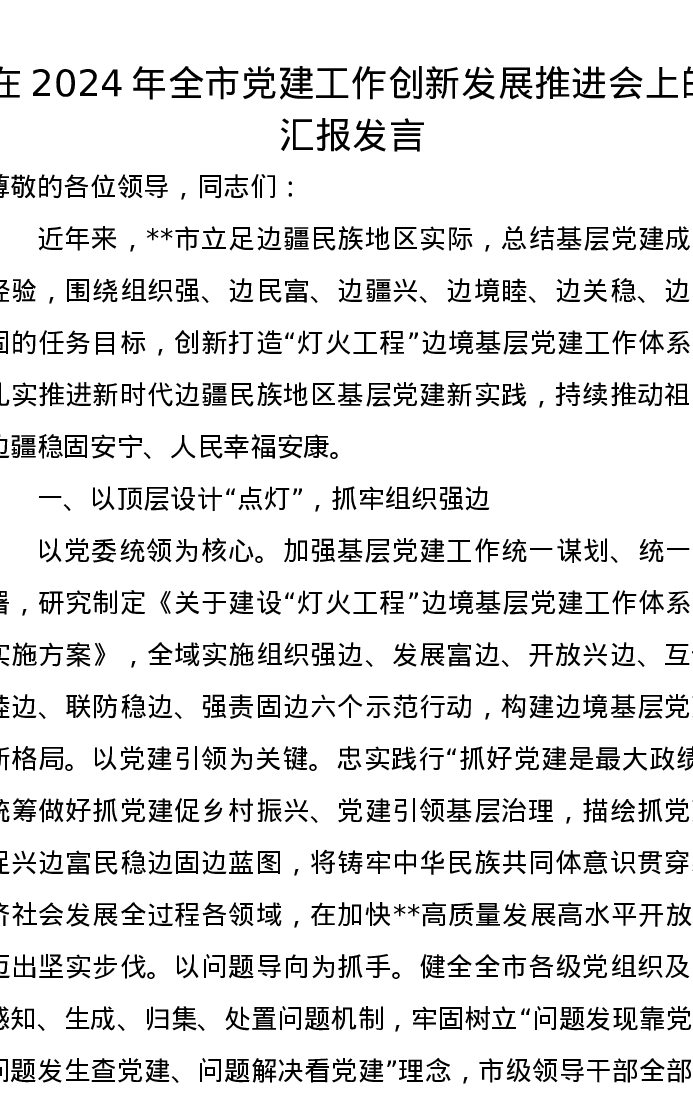 在2024年全市党建工作创新发展推进会上的汇报发言