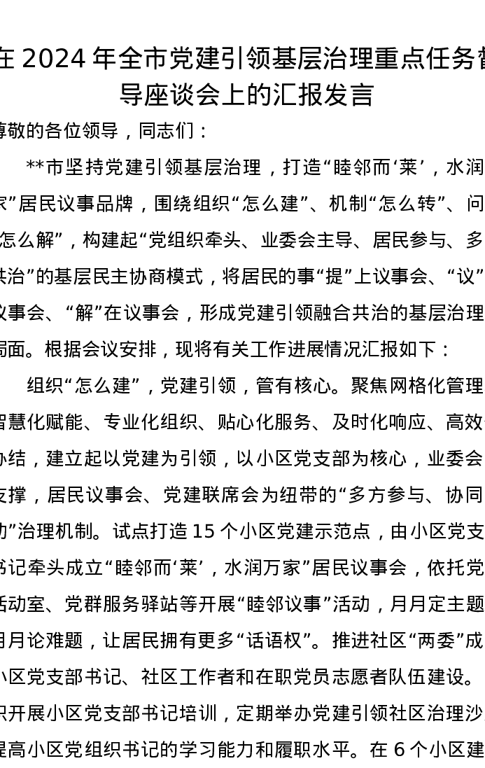 在2024年全市党建引领基层治理重点任务督导座谈会上的汇报发言