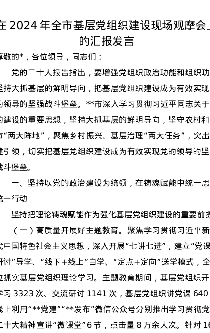 在2024年全市基层党组织建设现场观摩会上的汇报发言