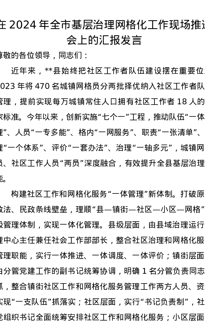 在2024年全市基层治理网格化工作现场推进会上的汇报发言