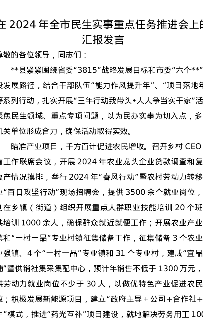 在2024年全市民生实事重点任务推进会上的汇报发言