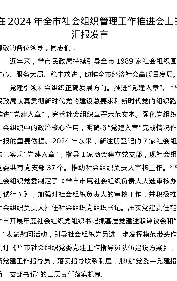 在2024年全市社会组织管理工作推进会上的汇报发言