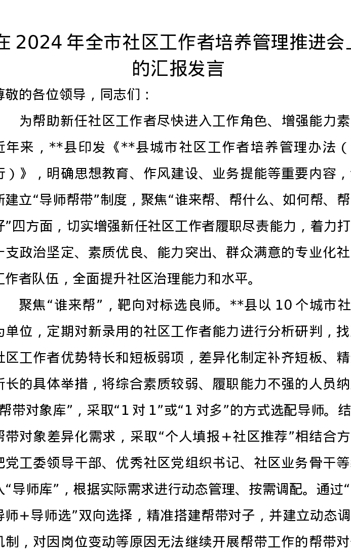 在2024年全市社区工作者培养管理推进会上的汇报发言
