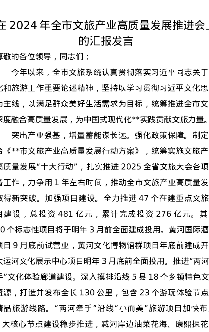在2024年全市文旅产业高质量发展推进会上的汇报发言