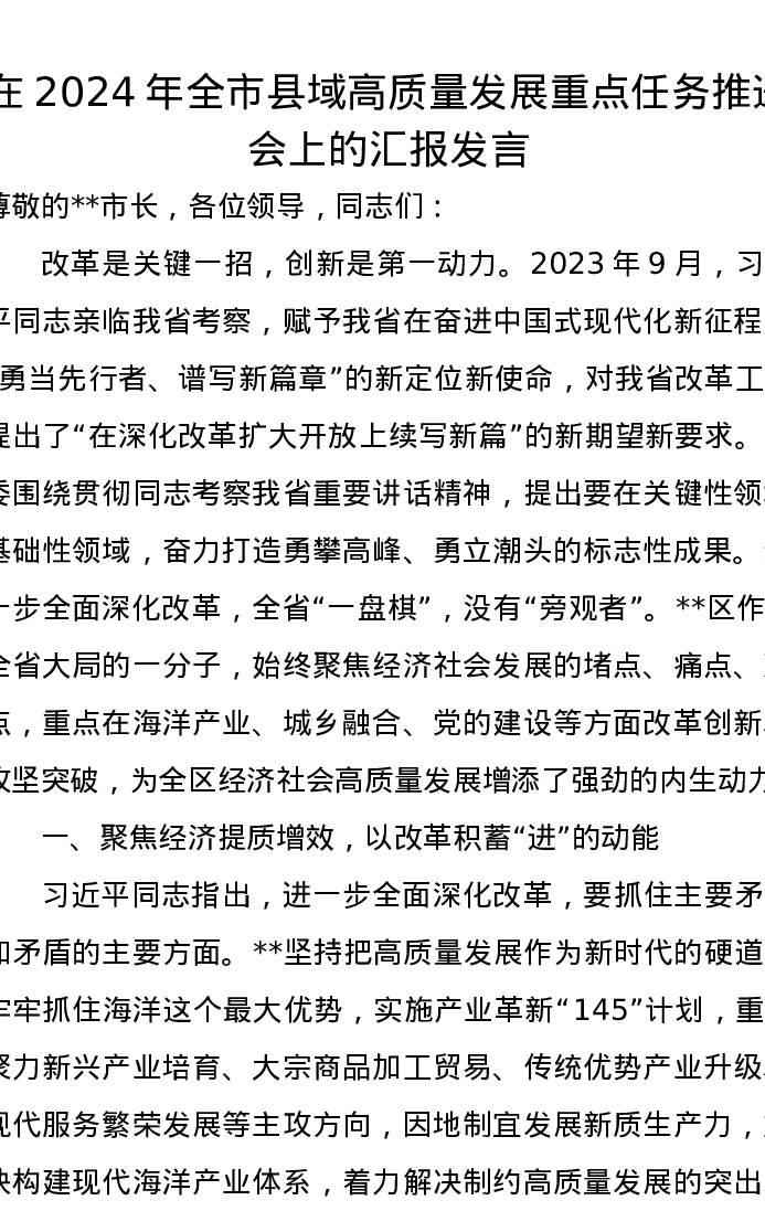 在2024年全市县域高质量发展重点任务推进会上的汇报发言