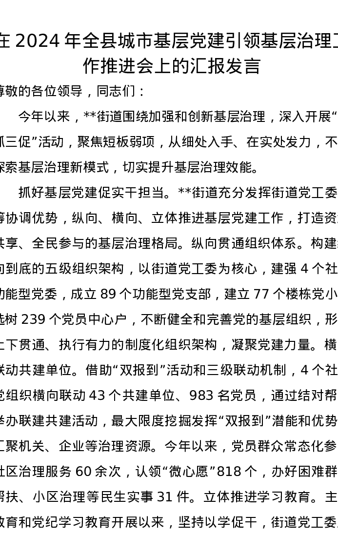 在2024年全县城市基层党建引领基层治理工作推进会上的汇报发言