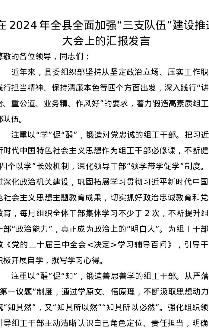 在2024年全县全面加强“三支队伍”建设推进大会上的汇报发言