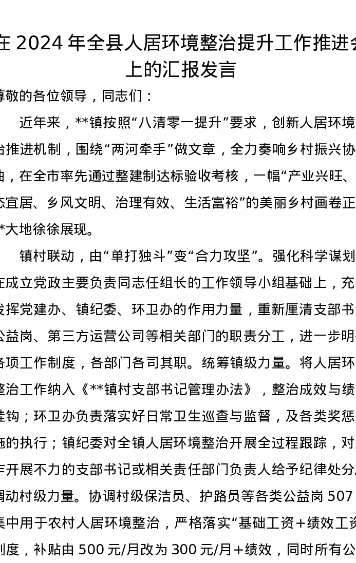 在2024年全县人居环境整治提升工作推进会上的汇报发言