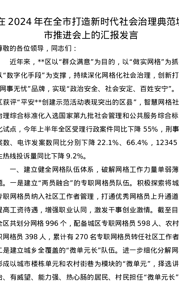 在2024年在全市打造新时代社会治理典范城市推进会上的汇报发言