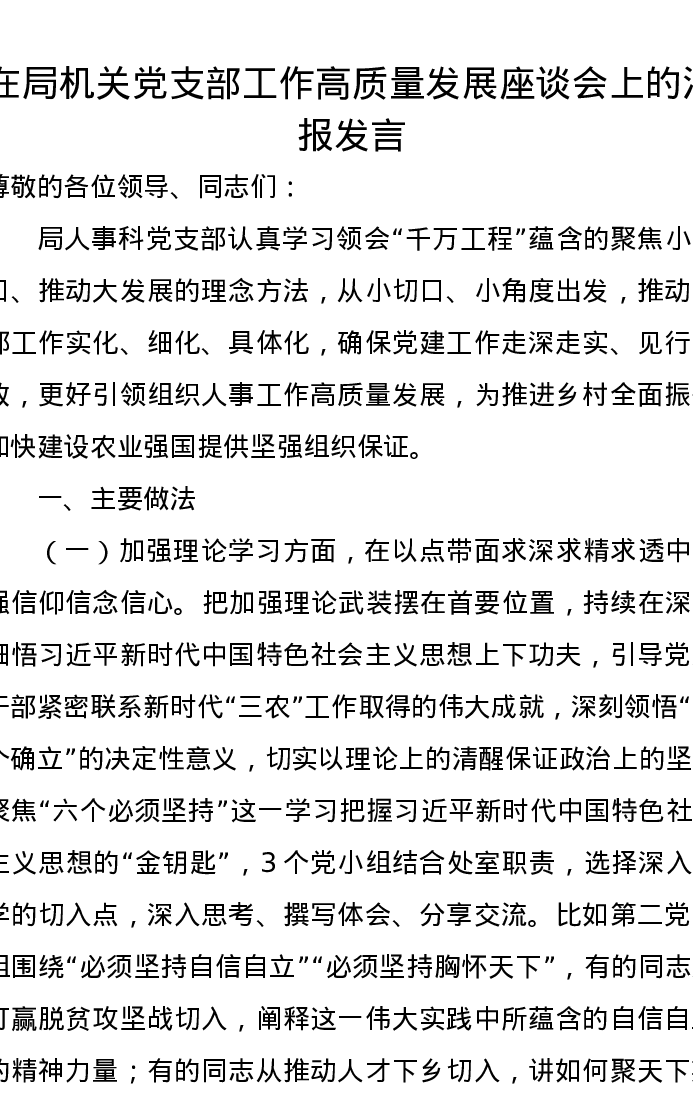在局机关党支部工作高质量发展座谈会上的汇报发言
