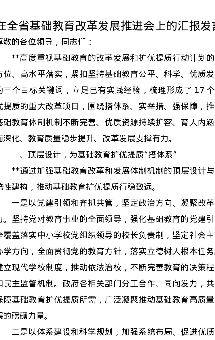 在全省基础教育改革发展推进会上的汇报发言