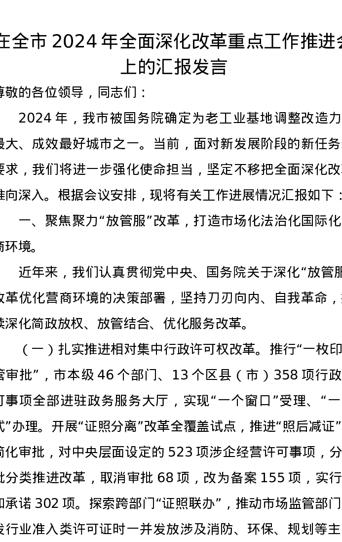 在全市2024年全面深化改革重点工作推进会上的汇报发言