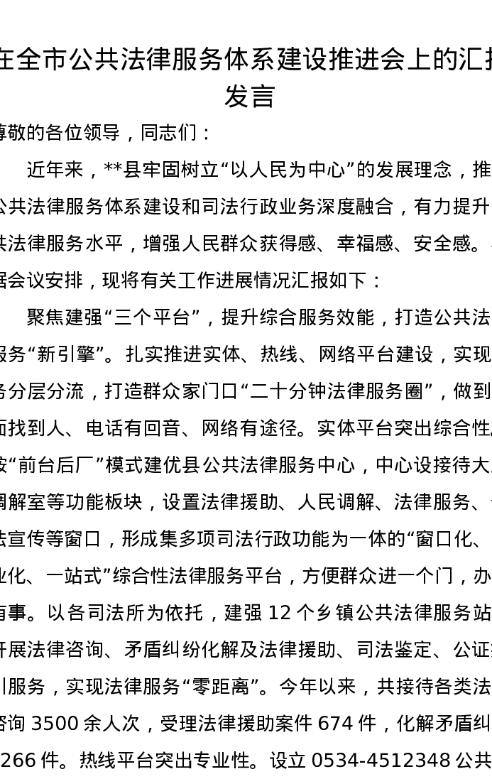 在全市公共法律服务体系建设推进会上的汇报发言