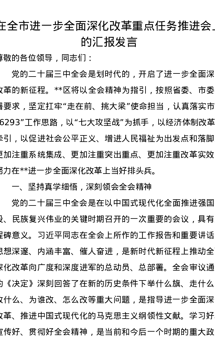 在全市进一步全面深化改革重点任务推进会上的汇报发言