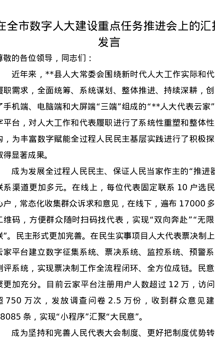 在全市数字人大建设重点任务推进会上的汇报发言