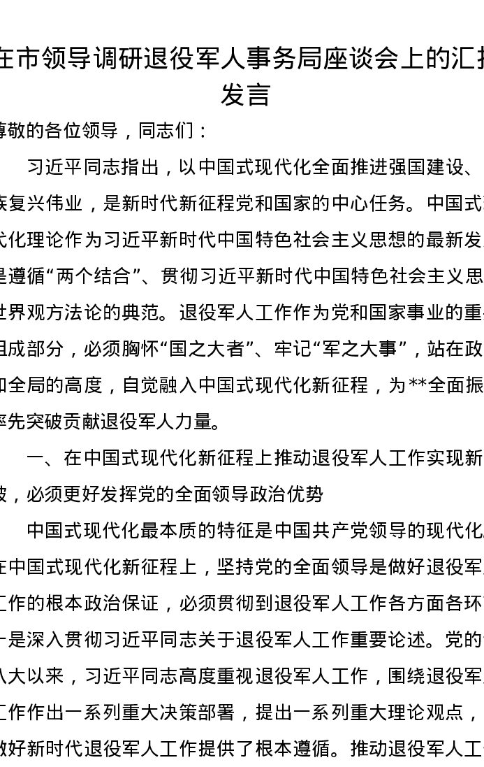 在市领导调研退役军人事务局座谈会上的汇报发言