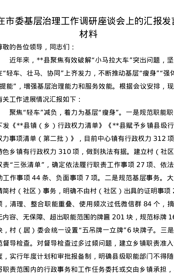 在市委基层治理工作调研座谈会上的汇报发言材料