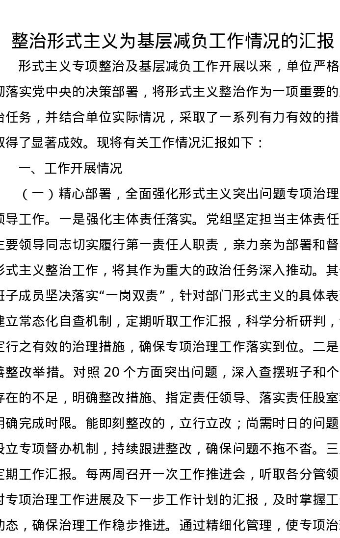 整治形式主义为基层减负工作情况的汇报