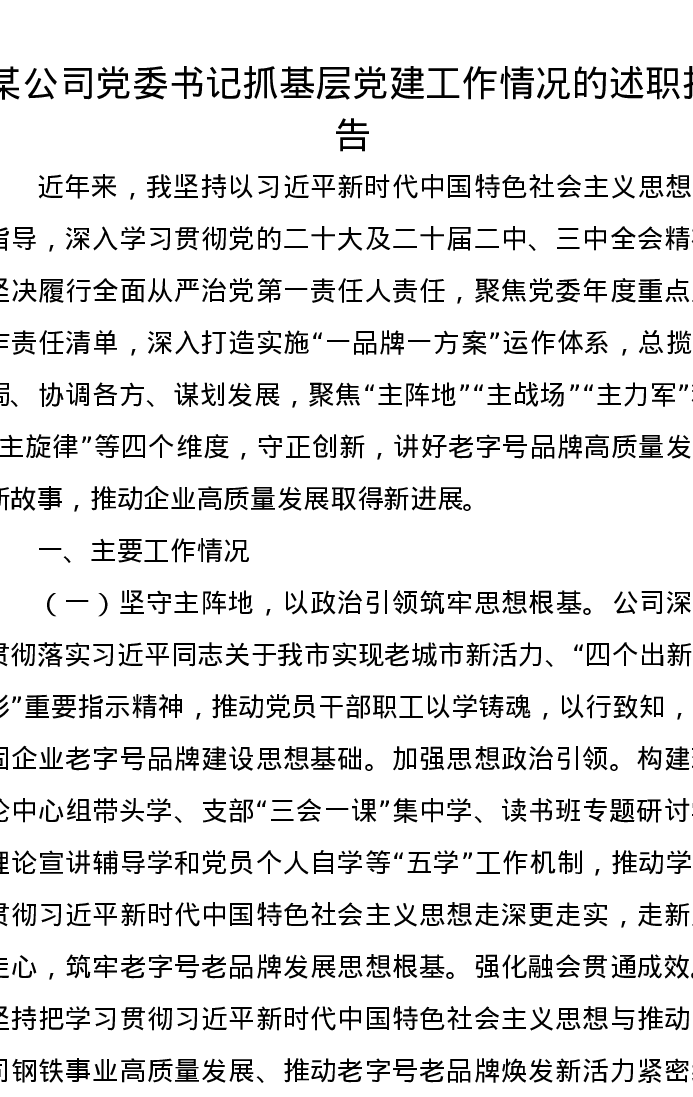 某公司党委书记抓基层党建工作情况的述职报告